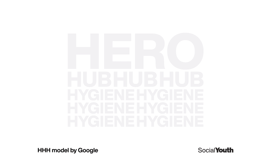 Het HHH-model verdeelt content in drie categorieën: Hero, Hub, en Hygiene. Elke categorie heeft een eigen doel en helpt om op verschillende manieren met je doelgroep in contact te komen: